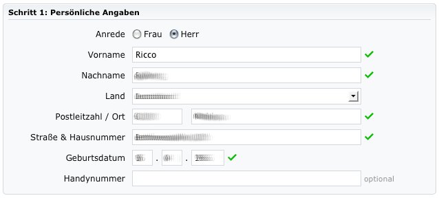 Im ersten Bereich sind verschiedene Angaben zur eigenen Person zu machen. Diese sollten wahrheitsgemäß erfolgen. Die Handynummer muss dabei nicht mit angegeben werden.