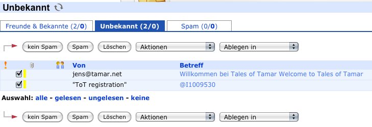 mit dem Betreff "I...." und "@...." sind Spielzüge für Tales of Tamar. Die Willkommensemail von jens@tamar.net beinhaltet das Passwort für den Forumsaccount. Beide E-Mails müssen vorne markiert werden und mittels dem Button