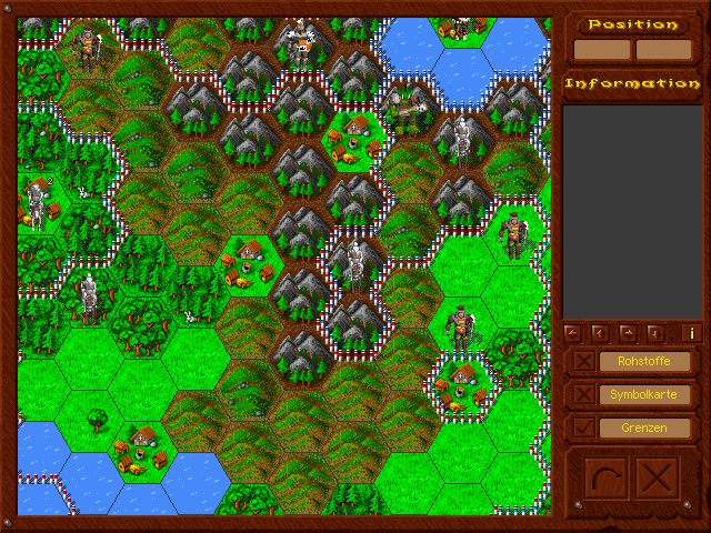Mit dem Schalter "Grenzen", welcher hier zu sehen ist, kann man die Grenzen zu den benachbarten Ländern einblenden, mit dem Schalter "Rohstoffe" kann man sich die Ressourcen der Felder anschauen und mit dem Schalter "Symbolkarte" werden die Namen der eigenen Städte eingeblendet.